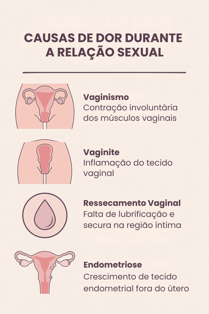 A dor pode ter causas físicas, como alterações na musculatura do assoalho pélvico, cicatrizes de parto ou inflamações, e causas emocionais, como ansiedade e insegurança.